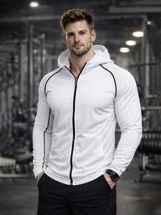 Mens White Polyster Compression Gym Hoodie Sweatshirt