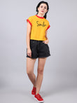 Women Slit Sleeves Smile Printed Pure Cotton T-Shirt, has a round neck, sleeveless