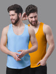 Men's Pack Of 2 Turquoise & Mustard Solid Pure Cotton Innerwear Gym Vest, has a round-neck, sleeveless