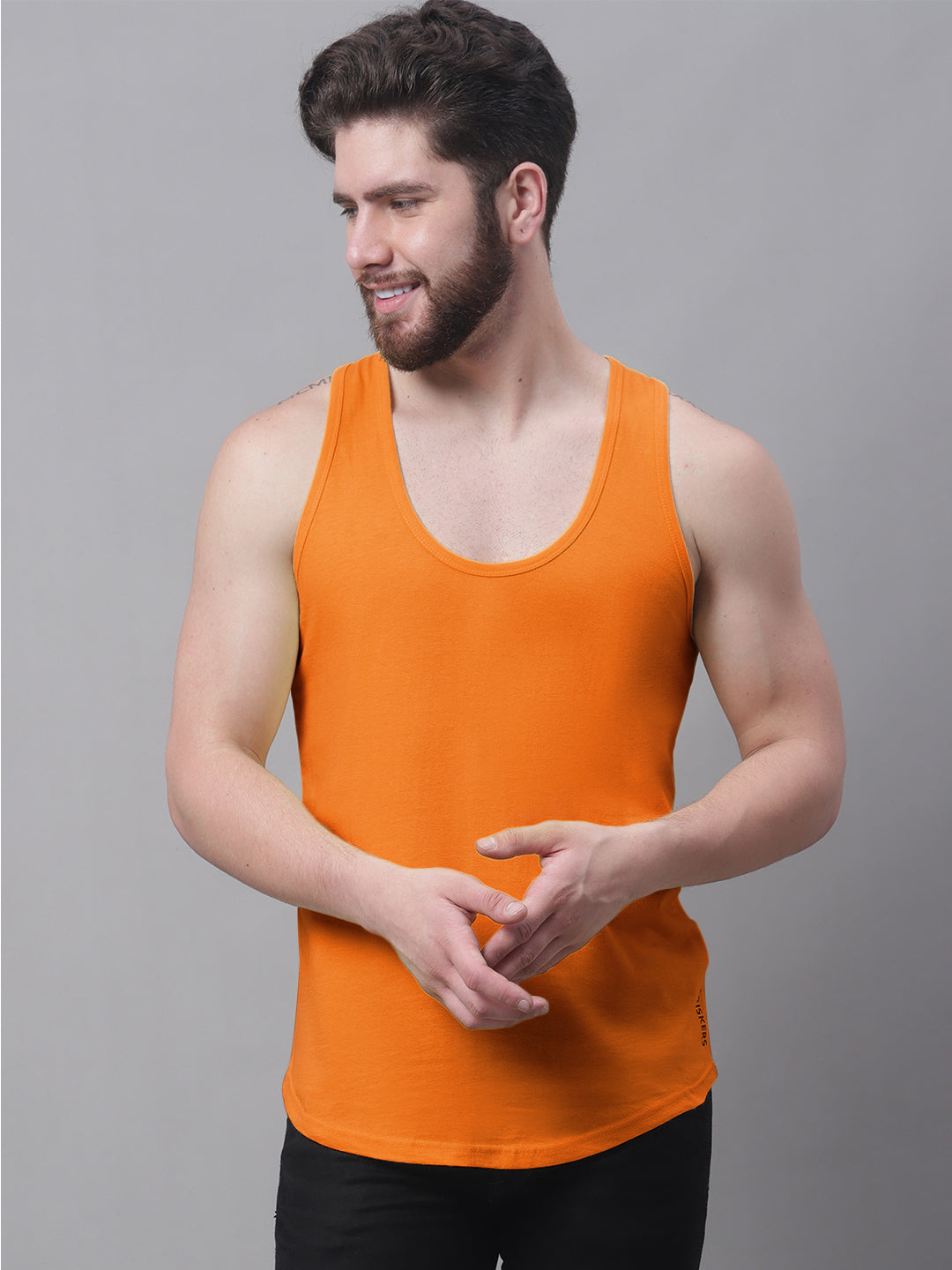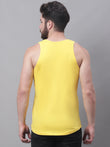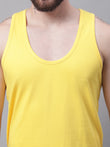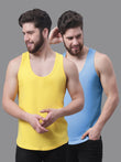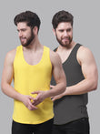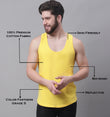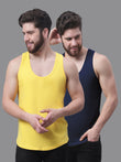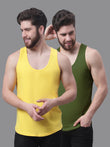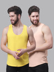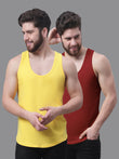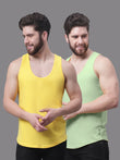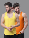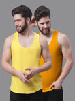 Men's Pack Of 2 Yellow & Orange Solid Pure Cotton Innerwear Gym Vest, has a round neck, sleeveless
